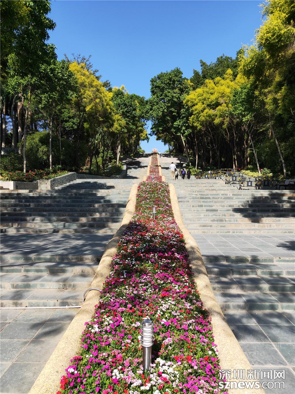 此次提升主要通過打造迎賓廣場花海,提升百步云梯、映翠湖、歡樂劇場周邊和南門廣場停車場等區(qū)域的綠化景觀效果。以“流花織錦”為主題,采用富有動感的流水和水波紋形態(tài),以活潑靈動的花帶、花毯等形式打造簡潔大氣、色彩斑斕的景觀;入口的游客中心建筑外墻改造為立體花墻,采用兩種深淺不一的紅色系矮牽牛等時花,以動感的波浪形式布置,踏步徐行,猶如悅動的旋律;原有的地下車庫屋頂區(qū)域則改造成趣味盎然的小游園,通過花境、鋪裝、藝術(shù)花壇統(tǒng)一設(shè)計布局,與流花織錦的主題緊密相應(yīng);百步云梯的中央花帶點綴于一片濃綠間,拾階而上,景色隨著高度變化,美景盡收眼底。