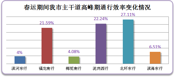 經(jīng)對我市城區(qū)主干道高峰期車流量監(jiān)測,預(yù)計(jì)春運(yùn)期間我市早晚高峰道路日趨順暢,全市各條主干道及進(jìn)出關(guān)道路平均通行效率提高一成,北環(huán)東行、泥崗路西行行車效率提升最為明顯。