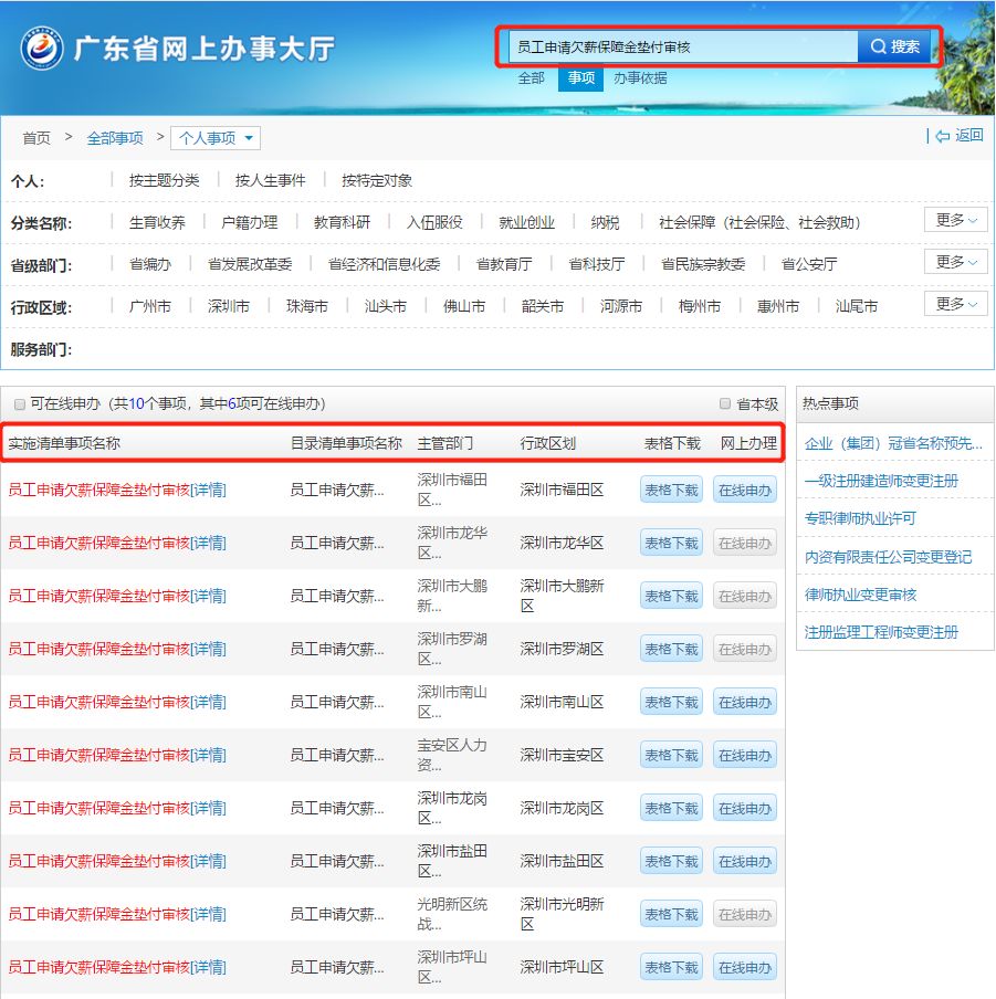 答:員工登錄廣東省網(wǎng)上辦事大廳官網(wǎng),點(diǎn)擊“個人事項(xiàng)”,在搜索欄中輸入“員工申請欠薪保障金墊付審核”,可查詢到各區(qū)“員工申請欠薪保障金墊付審核”事項(xiàng),選擇所在區(qū)點(diǎn)擊“詳情”,即可查詢到所在區(qū)人力資源部門的咨詢電話、辦理地址、辦理時間和交通指引等相關(guān)信息。