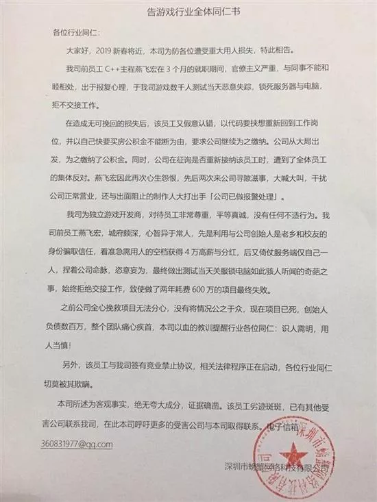 1月20日,深圳市螃蟹網(wǎng)絡(luò)科技有限公司創(chuàng)始人尹柏霖發(fā)文控訴,前員工燕某在游戲上線測試當(dāng)天(2017年12月15日),鎖死服務(wù)器與電腦,并惡意失蹤,致公司損失慘重。尹柏霖稱,“我們上線不了也測試不了,等新員工到職后熟悉新代碼又是幾個月過去了。”