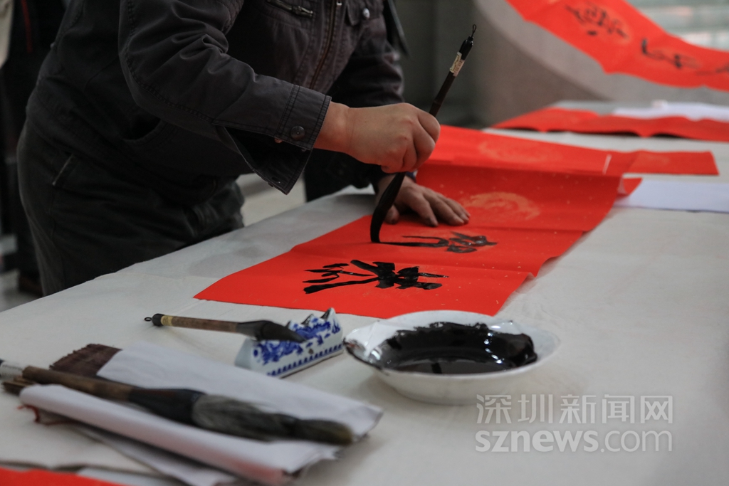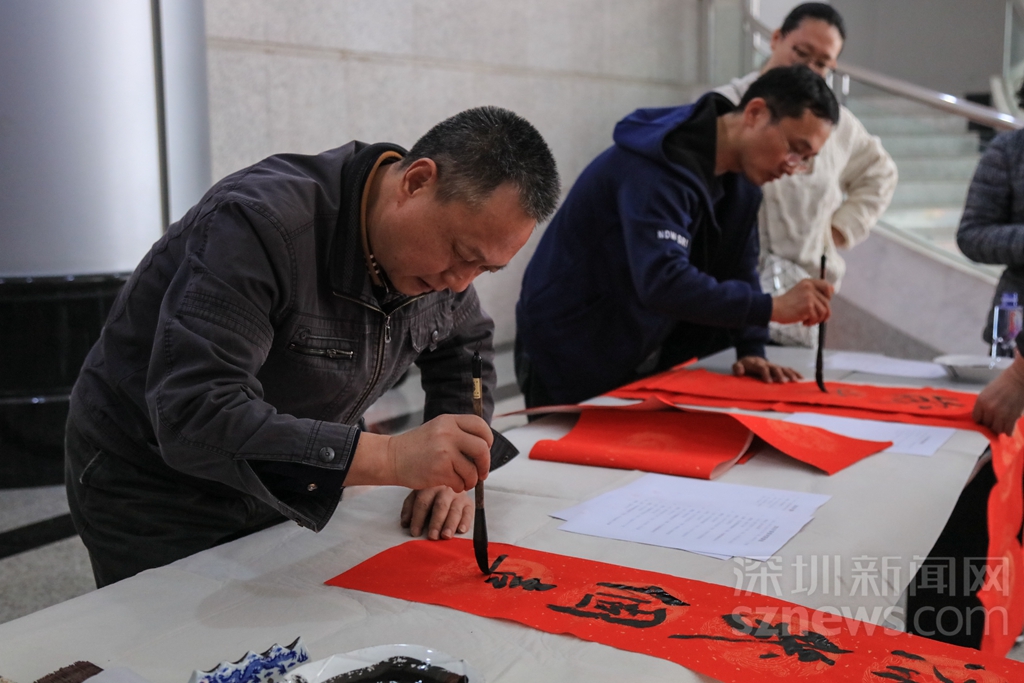 過年貼春聯(lián),是中華民族的傳統(tǒng)習(xí)俗之一。可以說,春聯(lián)一出,年味十足。記者在深圳商報大廈一樓活動現(xiàn)場看到,工作人員早已準(zhǔn)備好了春聯(lián)的紅紙和筆墨,多位書法了得的記者編輯揮毫潑墨,創(chuàng)作出了一幅幅寓意喜慶吉祥的對聯(lián),并免費(fèi)贈送給同事。不少人為了能拿到新鮮出爐的春聯(lián),提前在現(xiàn)場排隊等候。