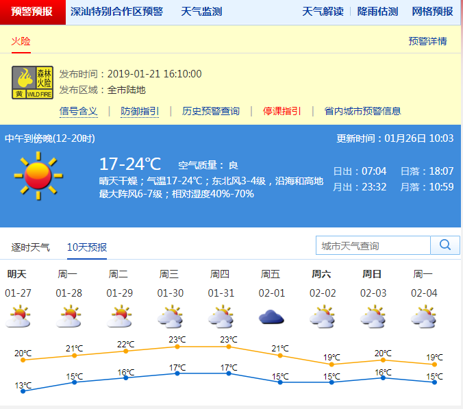 深圳新聞網(wǎng)2019年1月26日訊 今日氣溫17-24℃,晴天干燥,相對濕度40%-70%。深圳市氣象局預(yù)計(jì)2019-01-27:晴天間多云,天氣干燥氣溫:12-20;2019-01-28:晴天間多云氣溫:15-21;2019-01-29:晴天間多云氣溫:16-21;2019-01-30:多云氣溫:17-22;2019-01-31:多云氣溫:17-23;2019-02-01:陰天間多云,有零星小雨氣溫:15-21;2019-02-02:多云氣溫:15-19;2019-02-03:多云氣溫:16-20;2019-02-04:陰天間多云,有分散小雨氣溫:15-19