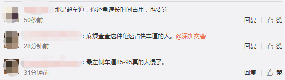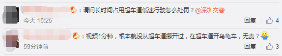 1月28日下午5點,深圳交警在微博上也給網(wǎng)友作出回復,對于長時間龜速占用超車道的行為也將一并調(diào)查。