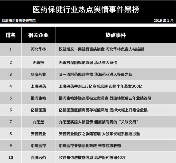 深圳新聞網(wǎng)2019年1月31日訊 (記者田志強 通訊員陳文光)1月31日,深圳企業(yè)輿情研究院發(fā)布第十二批企業(yè)輿情榜單。本次榜單重點聚焦房地產(chǎn)及醫(yī)藥保健兩個行業(yè)。醫(yī)藥保健行業(yè)輿情榜單由醫(yī)療保健行業(yè)熱點輿情事件排行榜(紅、黑榜)及醫(yī)藥保健行業(yè)企業(yè)公眾形象排行榜組成。