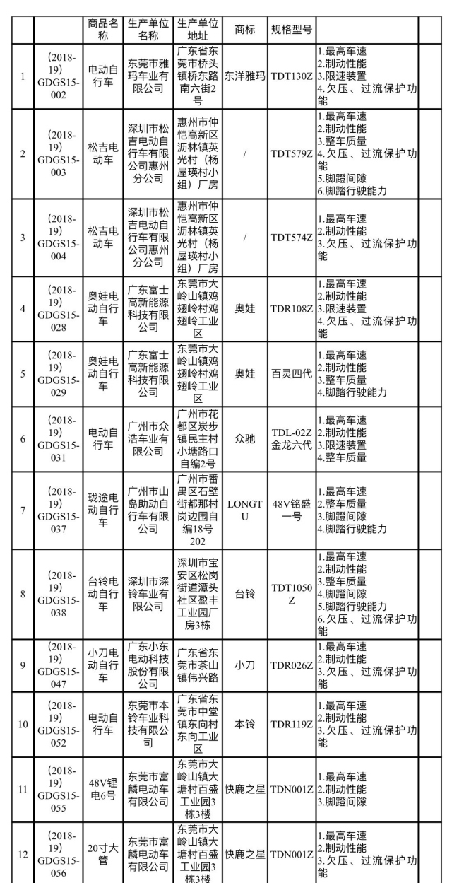 南方網(wǎng)2019年2月14日訊 2月13日,廣東省市場監(jiān)督管理局發(fā)布2018年度流通領(lǐng)域電動自行車(含電池和充電器)商品質(zhì)量抽查檢驗結(jié)果,60款電動自行車(含充電器)監(jiān)督總體不合格。其中,電動自行車31款不合格,電動自行車充電器29款不合格,愛瑪、臺鈴、東洋雅瑪、奧娃等品牌紛紛上榜。