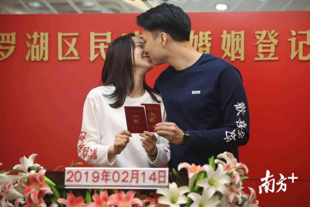 我們結(jié)婚啦!2月14日情人節(jié),一大早,深圳市羅湖區(qū)民政局婚姻登記處迎來許多對新人前來登記結(jié)婚。頒發(fā)證件、許下諾言、親密相吻……一對接一對的新人完成莊重的儀式,留下甜蜜蜜的合影,浪漫的氣息彌漫整個空間。南方日報(bào)記者朱洪波攝影報(bào)道