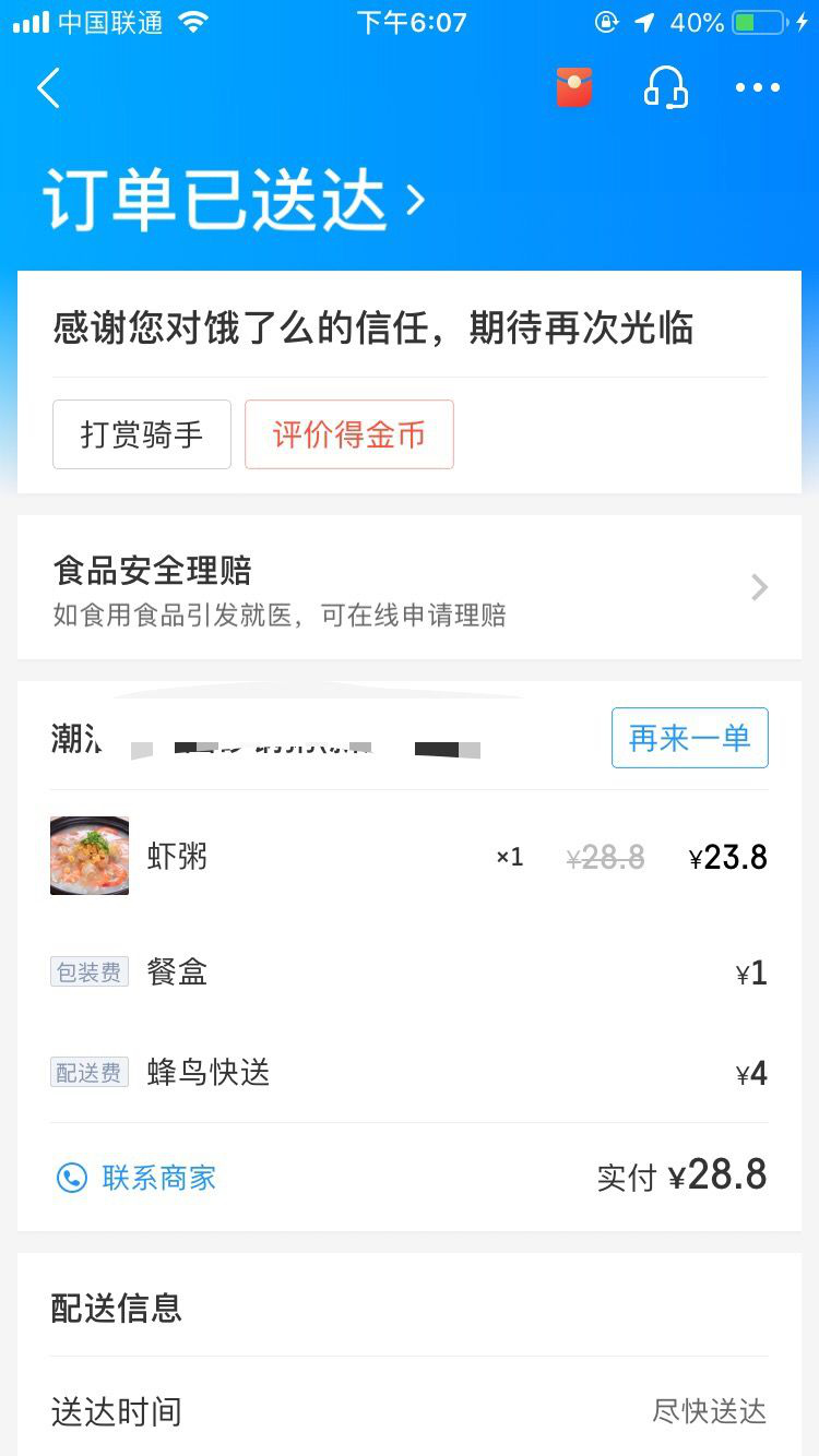 2月12日上午10點(diǎn)多,市民黃先生在餓了么外賣平臺點(diǎn)了一份潮汕砂鍋粥。2個(gè)小時(shí)后,肚子快餓癟的黃先生等到了外賣小哥的電話。外賣小哥告訴他,外賣在電動(dòng)車上被偷了,對此很抱歉,麻煩黃先生重新點(diǎn)餐,并希望添加他的微信進(jìn)行賠償。