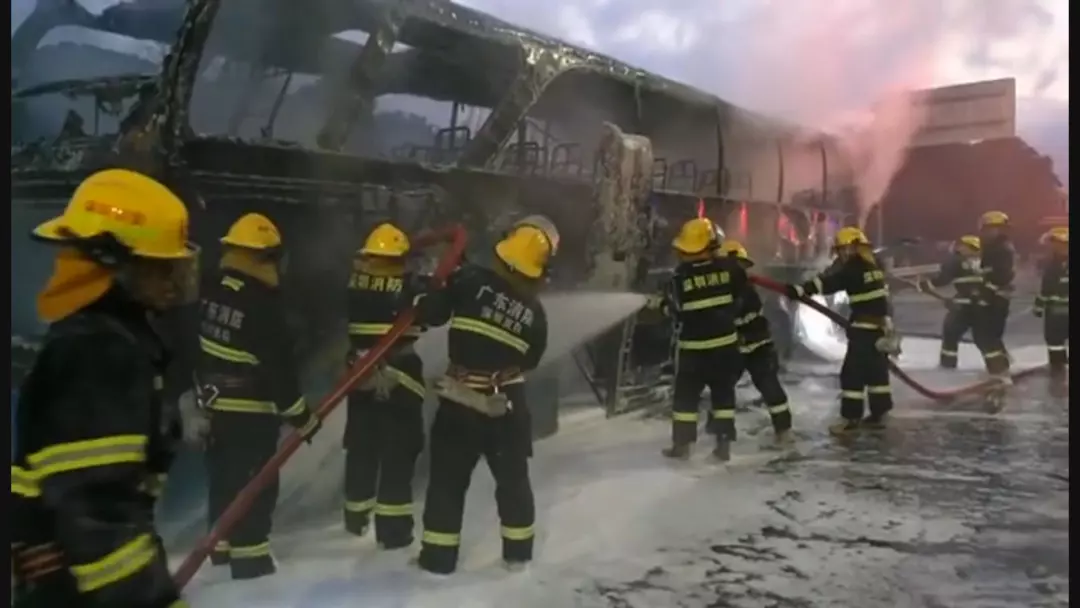 通過(guò)泡沫滅火劑覆蓋的方式,火勢(shì)最終得到控制,但整個(gè)大巴也被燒的只剩下框架。車上的兩名司機(jī)介紹,他們從桂林發(fā)車來(lái)到深圳,因?yàn)閯倓傇诟浇囌鞠驴停嚿喜o(wú)乘客。而起火原因兩人也并不清楚。