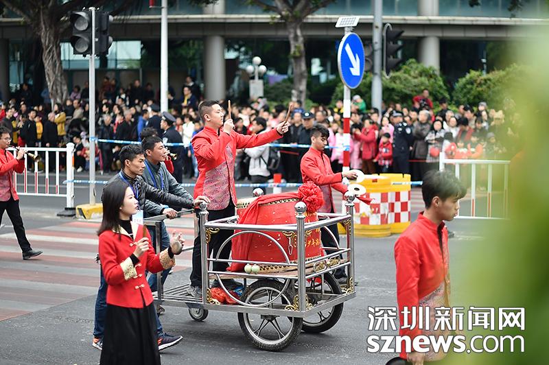 傳統(tǒng)的潮州大鑼鼓也在巡游隊(duì)伍中敲響