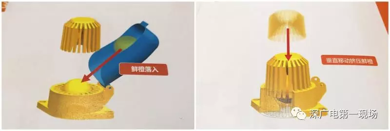 經(jīng)監(jiān)管人員調(diào)取相關(guān)技術(shù)圖紙,確認這兩個碗狀的金屬部件就是“上下爪”,大部分材質(zhì)為鋁合金,是榨取橙汁的核心部件,通過垂直合攏上下爪,對兩爪之間的橙子施加壓力,擠出的橙汁經(jīng)由橙子下方的孔洞流入不銹鋼儲汁桶,再經(jīng)由導(dǎo)流管將橙汁注入紙杯內(nèi),售賣給消費者。