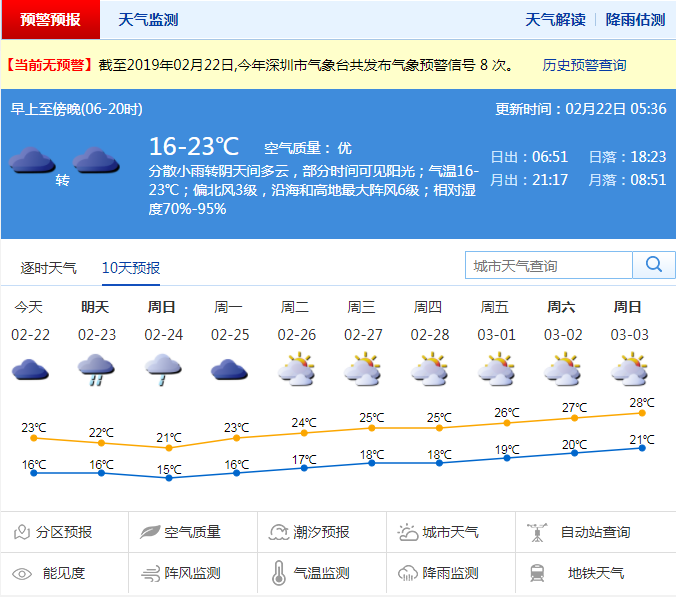 深圳新聞網2019年2月22日訊 最近兩天深圳氣溫回升,宛若初夏。今日,全市陰天為主,局部偶有零星小雨,氣溫明顯下降,最低氣溫16℃,提醒市民注意保暖。