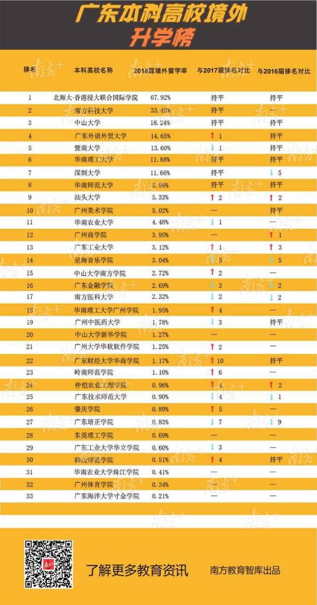 廣東外語外貿(mào)大學境外留學人數(shù)顯著提升,2018屆共有275人升入世界排名前100名的高校深造。兩所內(nèi)地與香港合作創(chuàng)辦的大學在境外留學率上處于全省前列。北京師范大學-香港浸會大學聯(lián)合國際學院持續(xù)多年保持全省第1位,此次共有811人留學,其中481人就讀世界前100名的大學。香港中文大學(深圳)僅公布總升學率65.67%,該校就業(yè)處相關負責人介紹,升學率中絕大部分是境外留學,176名學生平均每人收到3份世界知名大學錄取通知書。