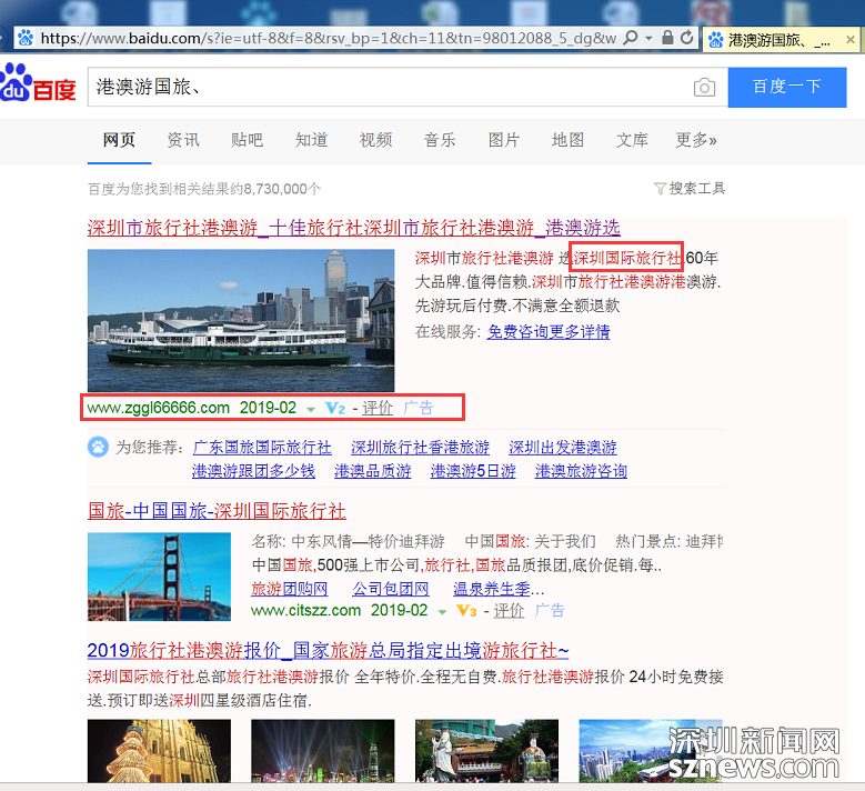 深圳市消委會模擬消費者網(wǎng)絡搜索實際使用場景,在百度搜索中搜索“港澳游國旅”等關(guān)鍵詞,進行了專項測試調(diào)查。調(diào)查發(fā)現(xiàn),搜素“港澳游國旅”等關(guān)鍵詞時搜索頁面會出現(xiàn)加V等級認證的旅行社廣告信息,但經(jīng)核實,“深圳信用網(wǎng)”商事主體登記信息中并無該企業(yè)。