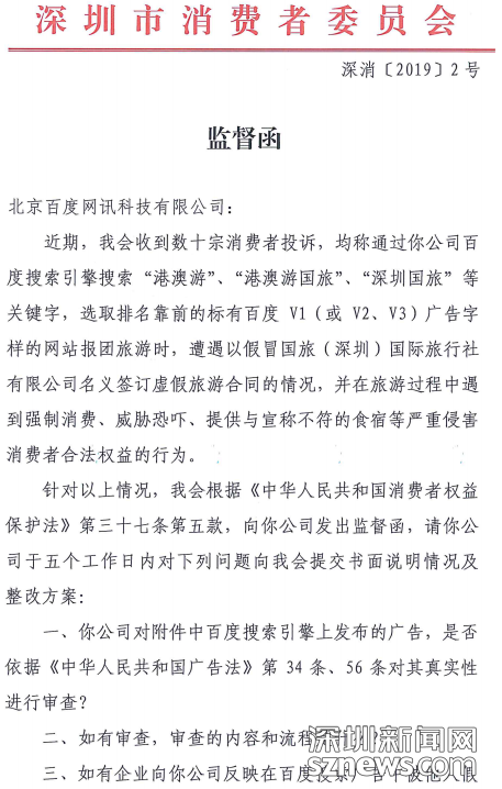2月26日上午,深圳市消費者委員會(以下簡稱“深圳市消委會”)就春節(jié)期間,不少外地消費者通過百度搜索廣告報名港澳游“野馬”旅行社上當被騙的問題,召開港澳游“野馬”旅行社投訴調(diào)查情況通報會,通報投訴調(diào)查進展情況。