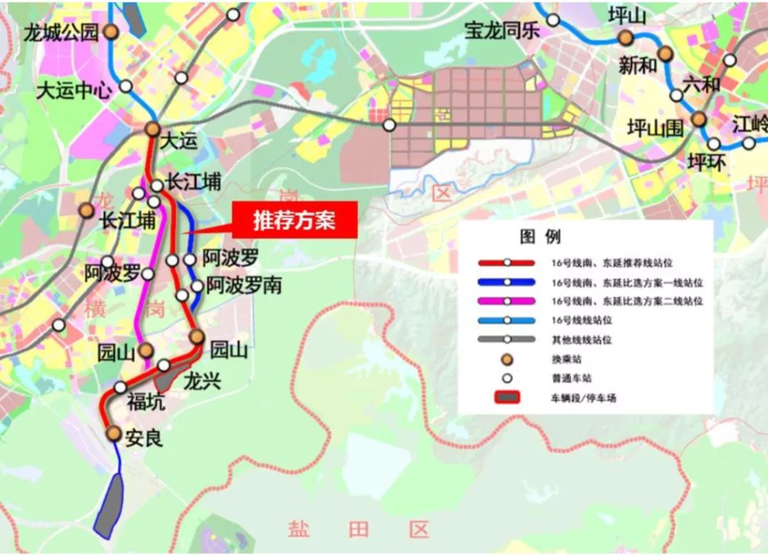 16號(hào)線南延線路從大運(yùn)站引出,設(shè)終點(diǎn)站安良站。線路全長(zhǎng)約7.8公里,采用地下敷設(shè)。