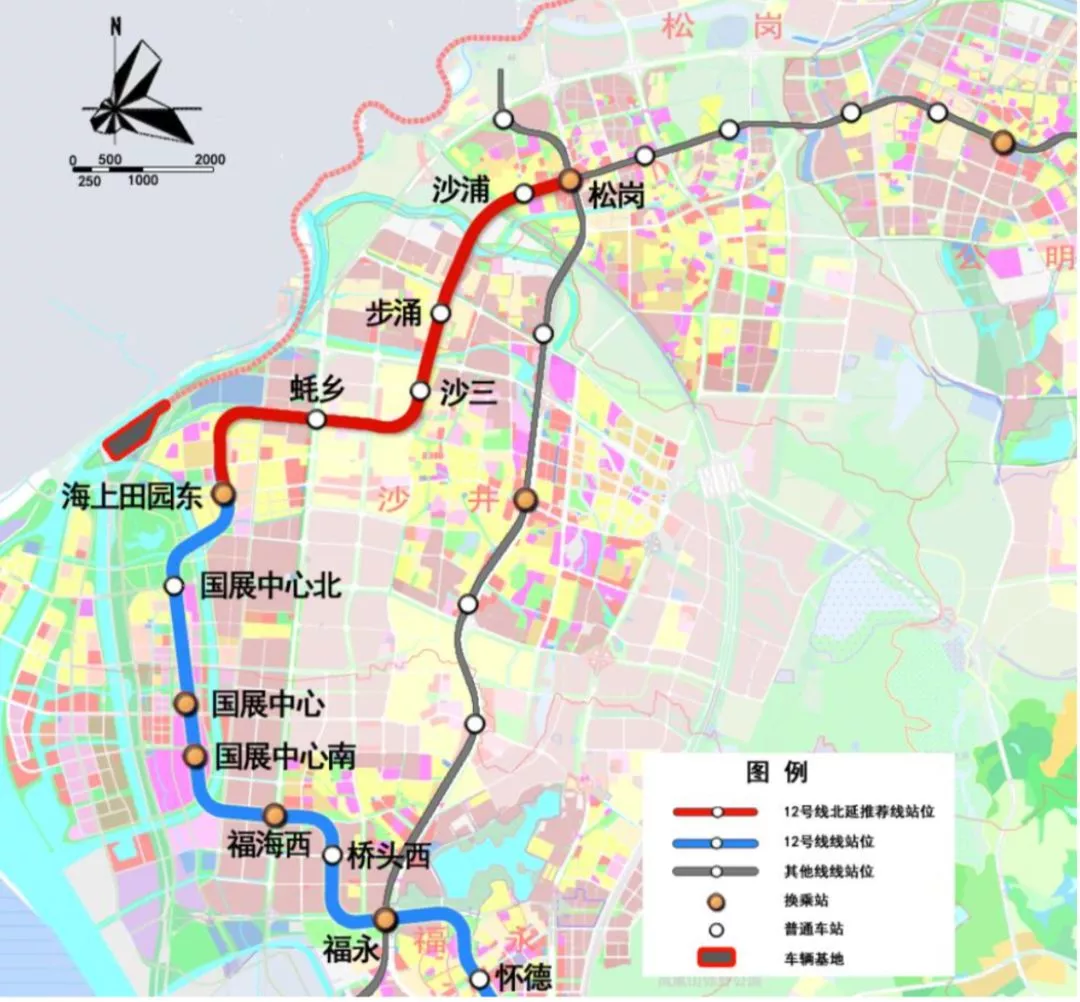 12號(hào)線北延線由在建地鐵12號(hào)線海上田園東站后,至沙江路與寶安大道交叉口前設(shè)置松崗站,與在建地鐵6號(hào)線和既有地鐵11號(hào)線換乘。全長(zhǎng)約8.2公里,采用地下敷設(shè)。