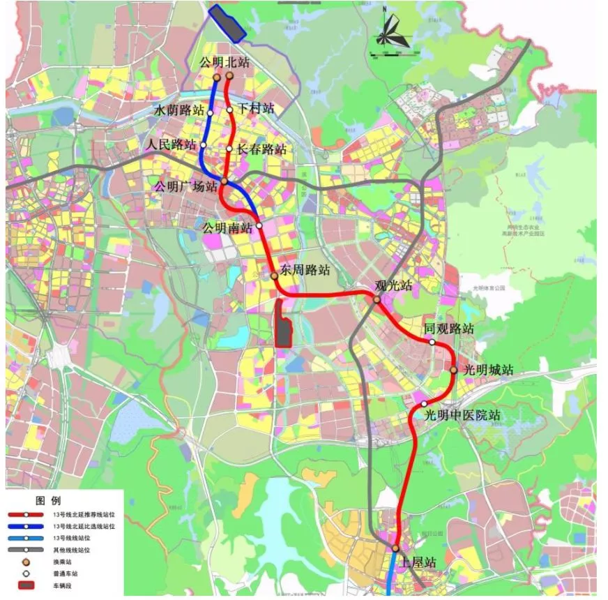 13號(hào)線北延線位于深圳市光明區(qū)境內(nèi),整個(gè)線路總體呈南北走向,終止于公明北站。線路全長(zhǎng)約19.2公里,采用地下敷設(shè)。
