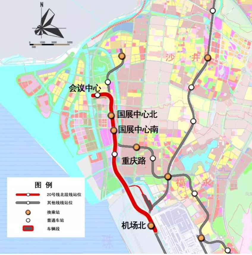 20號(hào)線北段起于寶安國(guó)際機(jī)場(chǎng)規(guī)劃T4航站樓,在規(guī)劃T4航站樓北側(cè),11號(hào)線東側(cè)設(shè)機(jī)場(chǎng)北站,與11號(hào)線、穗莞深城際線換乘。
