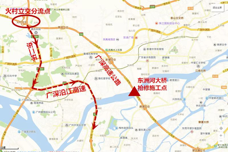 據(jù)廣深高速相關(guān)人員介紹,東洲河大橋南行將于3月7日6時至18時進行封閉施工,施工預(yù)計需要12小時。施工期間路段實行交通管制,單幅全封閉廣深高速公路廣州往深圳方向新塘至麻涌路段,同時封閉蘿崗收費站、新塘收費站的深圳方向入口,過往車輛需要注意選擇繞行路線。換梁施工期間,橋下上行和下行的通航孔也將進行航道管制。