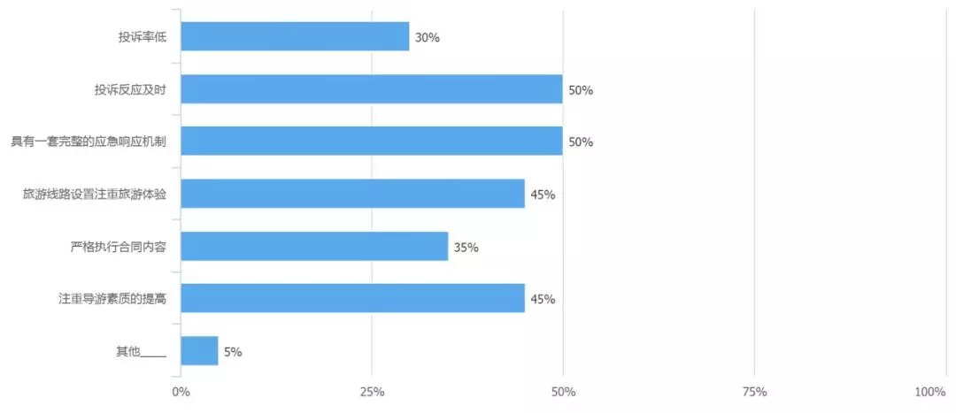 在眾多的旅游體驗當(dāng)中,消費(fèi)者遇到的最主要的問題是強(qiáng)制購物、遭遇虛假宣傳、臨時更改旅游線路等問題,同時消費(fèi)者在選擇旅游線路時,“野馬旅行社”、導(dǎo)游的服務(wù)態(tài)度、安全等問題也在重點考慮范圍內(nèi)。在改進(jìn)旅行社服務(wù)質(zhì)量方面,80%的消費(fèi)者認(rèn)為現(xiàn)狀需要政府和網(wǎng)絡(luò)共同關(guān)注,才能營造良好的旅游環(huán)境。旅行社對于投訴案例的反應(yīng)機(jī)制和反應(yīng)速度,之后也將成為消費(fèi)者在選擇旅行線路時的重要考量標(biāo)準(zhǔn)之一。
