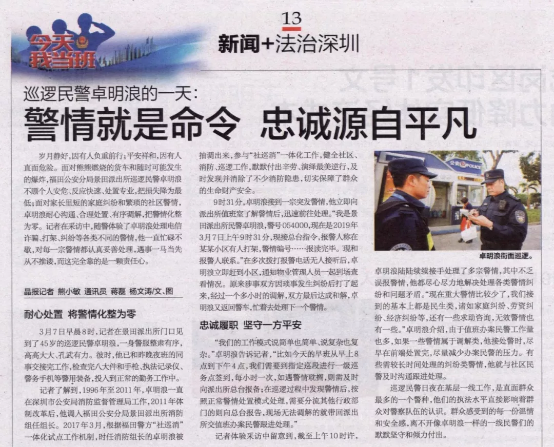 巡邏民警日夜在基層一線(xiàn)工作,是直面群眾最多的一個(gè)警種,他們的執(zhí)法水平直接影響著群眾對(duì)警察隊(duì)伍的認(rèn)識(shí)。群眾感受到的每一份溫情和安全感,離不開(kāi)像卓明浪一樣的一線(xiàn)民警們的默默堅(jiān)守和傾力付出。