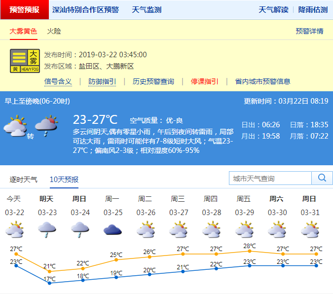 深圳新聞網(wǎng)2019年3月22日訊 記者從深圳市氣象局獲悉,今日白天轉(zhuǎn)陣雨或雷雨,局部可達(dá)大雨,并可能伴有7-8級短時(shí)大風(fēng);23-24日云量較多伴有小雨,氣溫下降5-6℃,天氣轉(zhuǎn)涼;25日轉(zhuǎn)多云,氣溫回升。