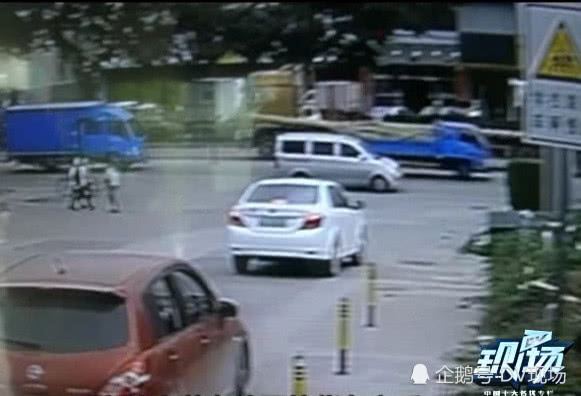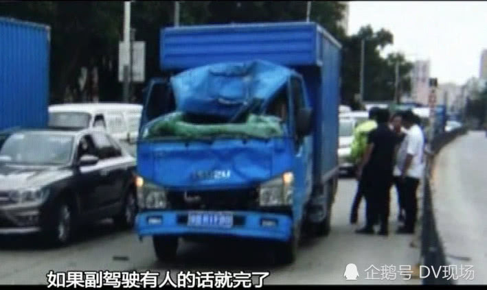 隨后裝竹子的前車開到斑馬線前突然剎車,緊跟其后的另一輛貨車剎車不及直接撞上,竹子直接插穿了后車的駕駛室,隨即車頭碎片橫飛,駕駛室嚴重變形。