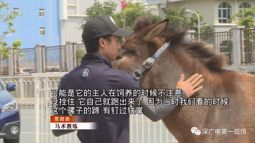 成年騾子路邊站崗是家養(yǎng)的,按照熱心市民留下的大概方位。記者在觀瀾街道庫坑社區(qū)平安路段終于看到了這個“稀客”的真容,只不過此時的它已經(jīng)被套上了韁繩,服服帖帖的站在馬術(shù)教練旁邊。