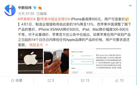 蘋果中國全系降價:iPhone最高降500元,用戶可退差價。4月1日,蘋果中國調(diào)整了旗下產(chǎn)品的售價相關(guān)話題也沖上熱搜第一。