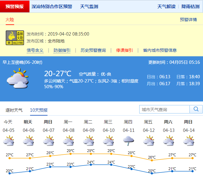 深圳新聞網(wǎng)2019年4月5日訊 深圳市氣象臺預(yù)計(jì),清明假期(5-7日)我市多云可見陽光,溫暖干燥。其中,5日氣溫20℃-27℃,相對濕度50%-90%,東風(fēng)2-3級;6-7日多云可見陽光;8-10日以多云為主,氣溫繼續(xù)上升,偶有分散陣雨。