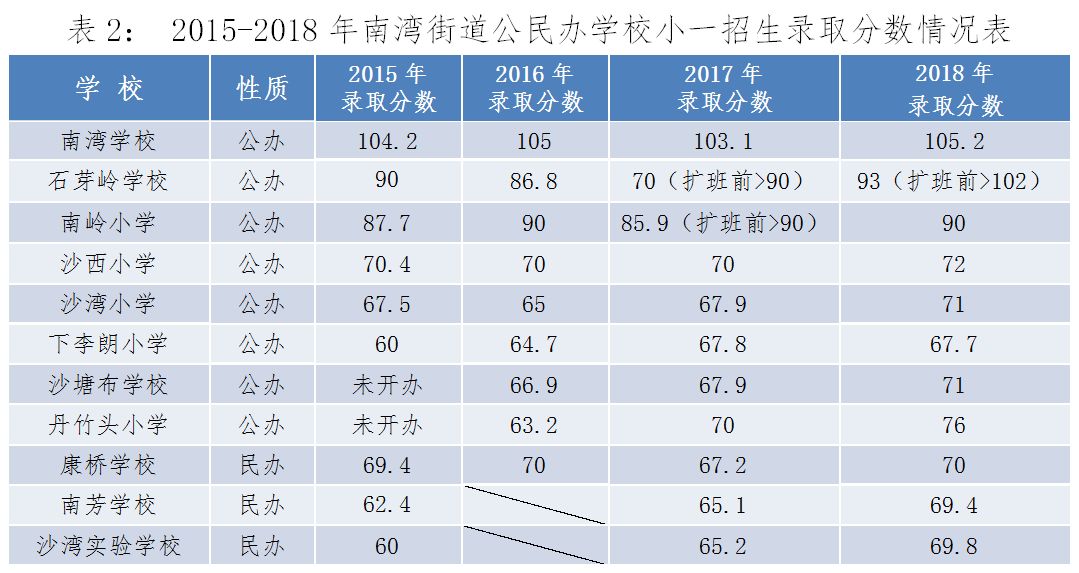 2015—2018年南灣街道公民辦學校小一招生錄取分數(shù)情況表