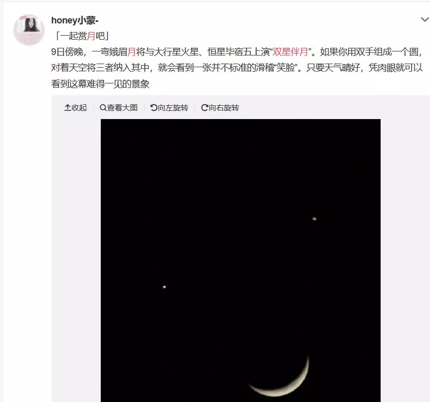 昨晚(4月9日),農(nóng)歷初五,機緣巧合,彎彎的月亮將從亮恒星畢宿五和大行星火星的中間路過。三者相聚在一起,形成“雙星伴月”的有趣天象。更有趣的是,三者擺成了一張笑臉的模樣:左上方的畢宿五為左眼睛,右方的火星為右眼睛,中間的月亮為嘴巴。