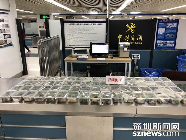 3月21日晚,兩名男性旅客各自提著兩個(gè)外形相似的大行李袋及一副魚(yú)竿,從羅湖口岸入境。在對(duì)其行李進(jìn)行X光機(jī)檢查時(shí),海關(guān)關(guān)員在機(jī)檢圖像中發(fā)現(xiàn)了異常,圖像顯示四個(gè)袋子中的物品呈現(xiàn)生物特征,而且有若干個(gè)相同的容器包裝著,于是海關(guān)關(guān)員要求兩名旅客打開(kāi)行李袋進(jìn)行詳細(xì)檢查。