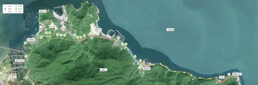 大鵬新區(qū)根據(jù)線路的地形、山海景觀、人文景觀的分布,確定了“打造‘兩線、三段、五大節(jié)點(diǎn)’的濱海生態(tài)自然課堂步道”。據(jù)新區(qū)建筑工務(wù)局負(fù)責(zé)人介紹,從新大河入??诘酱髞啚澈0堵咕讘已?,全長(zhǎng)18.7公里的海岸線上分布著河流、山林、海灘、溪流、濕地等多樣生態(tài)系統(tǒng)。2017年7月,大鵬新區(qū)按照濱海慢行系統(tǒng)示范工程標(biāo)準(zhǔn),動(dòng)工建設(shè)新大-鹿嘴市政綠道?!皟删€”指的是沿著海岸的濱海徒步路線和城市二號(hào)綠道線,兩條線之間的6.6平方公里土地將形成一座開放的郊野公園;“三段”分別為活力生活段、自然生態(tài)段和休閑旅游段;“五大節(jié)點(diǎn)”為山海綠畔、古廟遺風(fēng)、東山凹、愛(ài)情灘、鹿咀山莊等自然景觀。