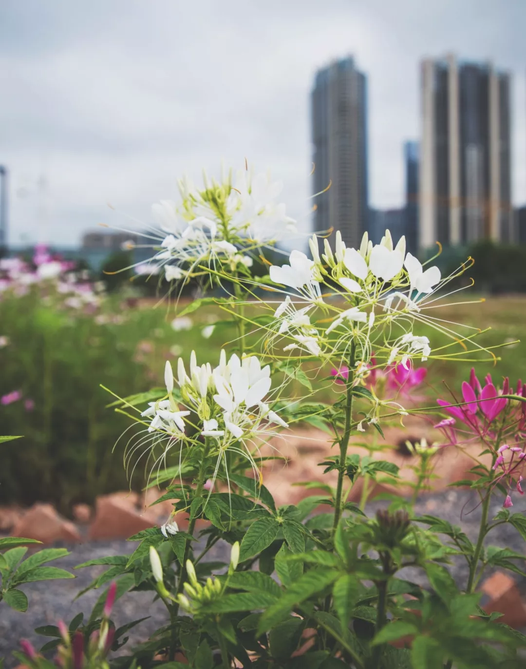 乍一看是不是有點(diǎn)像彼岸花?不過(guò)它倆卻算不上什么親戚。醉蝶花盛開(kāi)時(shí),總狀花序形成一個(gè)豐滿(mǎn)的花球,朵朵小花猶如翩翩起舞的蝴蝶,靈動(dòng)迷人。