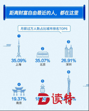深圳特區(qū)報(bào)2019年4月23日訊 月薪過萬人數(shù)占比城市排名 TOP6:上海、北京、深圳、南京、杭州、廣州;其中,北上廣深受訪者中月薪在5000至8000元人數(shù)居多;薪酬水平最高的三個(gè)行業(yè)分別是:互聯(lián)網(wǎng)、房地產(chǎn)、金融;受訪者中工作10年月薪過萬人數(shù)不足三成、過六成受訪者工資不及預(yù)期、逾七成受訪者因?yàn)楣べY考慮跳槽;五成受訪者用于理財(cái)?shù)腻X不足工資20%、近五成受訪者在第三方互聯(lián)網(wǎng)理財(cái)平臺(tái)進(jìn)行工資理財(cái)。