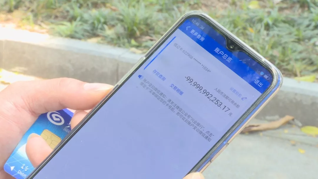 楊先生在今年2月中旬,經(jīng)朋友介紹來到深圳坪山工作,公司統(tǒng)一辦理了興業(yè)銀行的工資卡。楊先生說,第一個月發(fā)工資時,他就發(fā)現(xiàn)工資取不出來,就以為是銀行卡沒激活,沒在意??墒钱?dāng)?shù)?月份的工資也用不了時,楊先生趕緊下載了手機銀行,這一查,嚇了一跳!賬戶余額顯示:-99,999,992,253.17 (負999億余元)。