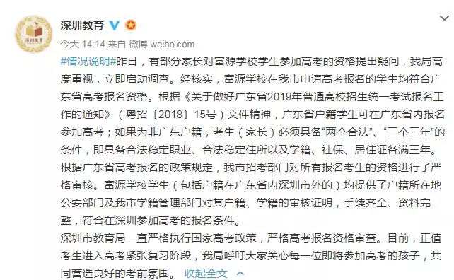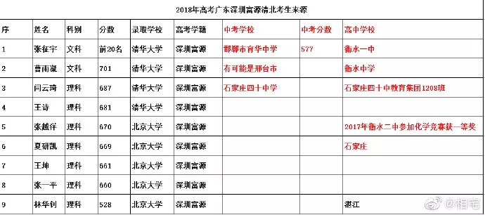 近日,深圳高三二模成績出爐,一所學校引起了深圳家長圈的高度關注。 有網(wǎng)友在微博上報料富源學校表現(xiàn)亮眼,一石激起千層浪,事件是怎么一回事呢?一起來看看 2019深二模各校尖子生成績 其中民辦學校寶安區(qū)富源學校異軍突起,尖子生占比遠超深圳最好的四大高中(深圳中學,深圳實驗中學,深圳外國語學校,深圳高級中學),引人注目。 網(wǎng)友議論紛紛 網(wǎng)友@相宅稱:深圳富源中學,18年考中清北的學生名單和初中來源統(tǒng)計,經(jīng)過人肉搜索和大數(shù)據(jù)比對,確認相關證據(jù),有非常大的高考移民嫌疑。廣東高考本來就難,名校指標更少,還來擠占惹起公憤。同時附上19年深圳高考二模的富源成績。今年還有沒有高考移民,還會不會擠占廣東的名校指標? 針對網(wǎng)上的報料和家長的質疑,深圳教育局@深圳教育回應稱 情況說明 #情況說明#昨日,有部分家長對富源學校學生參加高考的資格提出疑問,我局高度重視,立即啟動調(diào)查。經(jīng)核實,富源學校在我市申請高考報名的學生均符合廣東省高考報名資格。根據(jù)《關于做好廣東省2019年普通高校招生統(tǒng)一考試報名工作的通知》(粵招〔2018〕15號)文件精神,廣東省戶籍學生可在廣東省內(nèi)報名參加高考;如果為非廣東戶籍,考生(家長)必須具備“兩個合法”、“三個三年”的條件,即具備合法穩(wěn)定職業(yè)、合法穩(wěn)定住所以及學籍、社保、居住證各滿三年。根據(jù)廣東省高考報名的政策規(guī)定,我市招考部門對所有報名考生的資格進行了嚴格審核。富源學校學生(包括戶籍在廣東省內(nèi)深圳市外的)均提供了戶籍所在地公安部門及我市學籍管理部門對其戶籍、學籍的審核證明,手續(xù)齊全、資料完整,符合在深圳參加高考的報名條件。 深圳市教育局一直嚴格執(zhí)行國家高考政策,嚴格高考報名資格審查。目前,正值考生進入高考緊張復習階段,我局呼吁大家關心每一位即將參加高考的孩子,共同營造良好的考前氛圍。 回應之下,小編根據(jù)現(xiàn)有的資料,發(fā)現(xiàn)了這些信息出入,一起接著往下看! 對比:富源學校深圳一模成績 成績單顯示,在前十名單里,富源學校獨占6位,而深圳四大公辦重點高中總和也只有4位,這是什么情況?對照看一看一模成績: 三年來深圳中考錄取情況: 富源學校可見生源不占優(yōu)勢 再來看一看三年來深圳中考錄取情況:富源學??梢娚床]有什么優(yōu)勢,總分460分的錄取分數(shù)比四大重點低了將近100分,但也不能因此說明該學校沒有尖子生源。 2018年富源學校高考清北名單:9位同學上清北 下圖是2018年幾所大學在廣東(理科)招生計劃: 但是,這幾名考進清北的同學,名字竟然出現(xiàn)在兩所不同的高中??? 考進廣東前20名的張征宇同學 網(wǎng)友爆料稱,深圳富源中學2018年高考喜報,特別宣傳了張征宇同學(后成功考入清華大學)。而他也出現(xiàn)在2015年的邯鄲市育華中學中考喜報上。乾坤大挪移,坐地日行八萬里! 家長質疑:富源中學光榮榜的同學 怎么又出現(xiàn)在衡水中學喜報上? 針對上面9位同學,搜索信息顯示,竟然有五位同學來自有名的高考大省河北。 在2018年的第31和32屆化學奧林匹克競賽的名單上,有一個共同的名字:崔一龍,但他們來自不同的學校。高二時他在衡水第一中學,高三他出現(xiàn)在深圳富源中學。 同時,該網(wǎng)友還發(fā)了一封 #一位深圳中學生家長寫給教育部的控訴信# 尊敬的國家教育部領導: 您好! 我是深圳市一名中學生的家長。這幾日網(wǎng)上流傳出一份深圳市高三年級第二次模擬考試前幾名學校分布成績單,其中民辦學校寶安區(qū)富源學校異軍突起,遠超深圳最好的四大高中(深圳中學,深圳實驗中學,深圳外國語學校,深圳高級中學)引起廣大家長的關注。隨后網(wǎng)上流傳出是富源學校與河北衡水中學之間的高考移民消息,具體操作是通過將河北衡水中學的尖子生戶口轉移到深圳富源學校,平時在衡水中學上課,考試在深圳富源學校,并參加深圳市高考。此情況幾年前已有,數(shù)量沒有那么大。今年突然大量此類考生出現(xiàn),大家猜測,如果不加管控未來必將愈演愈烈。 作為一名普通深圳市民和學生家長,我守法遵紀,但是實在難以接受這樣的現(xiàn)實。希望教育部能夠徹查此事,查明真相,還廣大家長和考生一個公道。 記者調(diào)查 網(wǎng)上傳出深圳高三二模數(shù)據(jù)圖,記者向深圳某中學老師證實了該表格的真實性。從數(shù)據(jù)中可看到,深圳二模全市前十共有11名,其中富源6名,深圳中學3名,深圳實驗學校和市高級中學各占1名。有家長質疑這是富源學校從衡水中學引入了高考移民,才導致二模成績一下子拔尖,并已申請要求有關部門徹查。 同時,小編梳理去年的報道發(fā)現(xiàn),張征宇同學此前的采訪顯示:張征宇初中、高中均就讀于富源學校,他當初就是被富源學校的特優(yōu)生政策吸引去的。 但是記者調(diào)查發(fā)現(xiàn),張征宇同學的名字出現(xiàn)在邯鄲市2015年中考喜報上。 此外,網(wǎng)上現(xiàn)正流傳富源模式:一方面從衡水挖學生過來利用深圳入戶容易這一點搞成深戶,在深圳高考,另一方面招深圳的孩子,學籍掛在深圳,送去衡水上課,再回深圳高考。 【這四大謎團仍待解】 盡管教育部門通報稱,經(jīng)核實,富源學校在深圳申請高考報名的學生