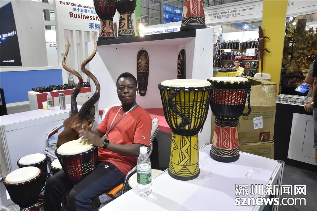 肯尼亞展區(qū)中,一位外籍表演人員正在表演非洲手鼓