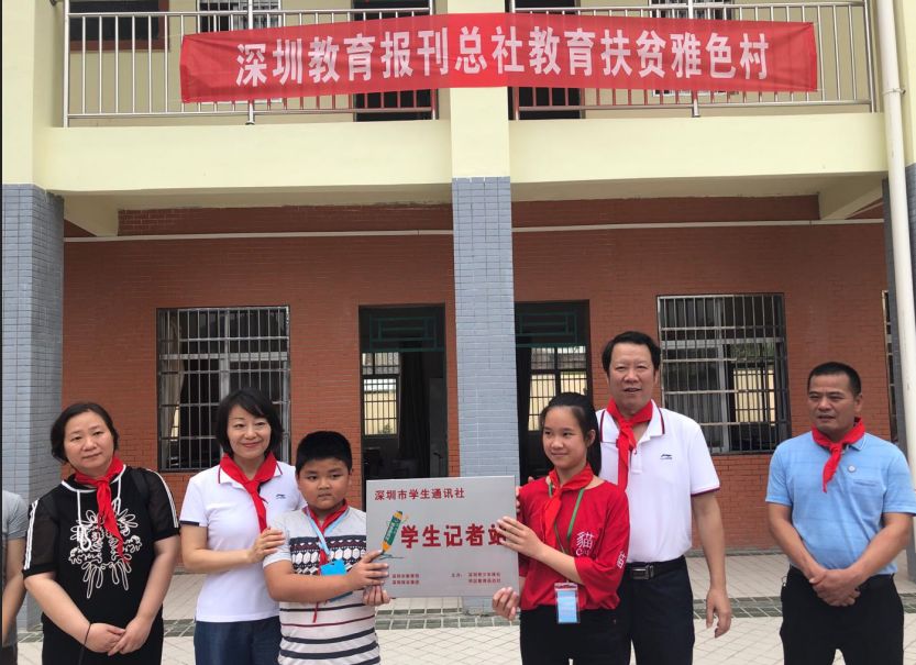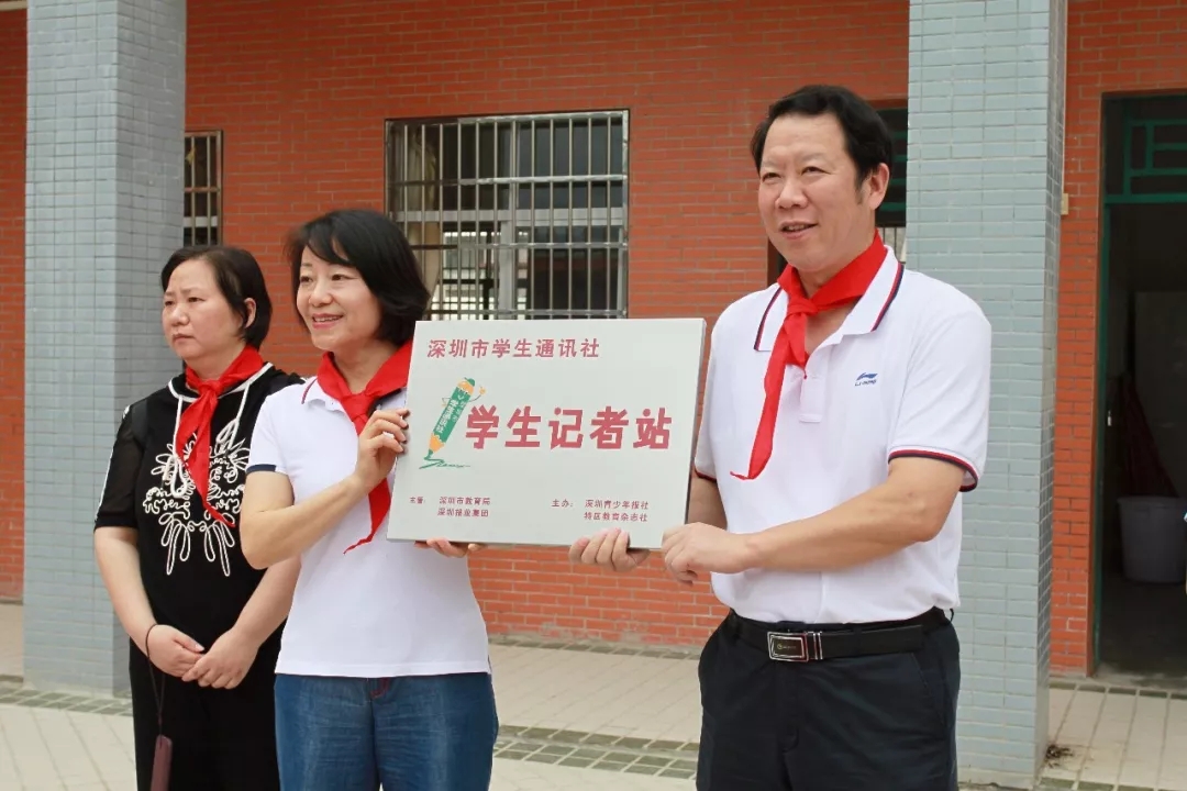 在捐贈儀式上,同學們?yōu)檫h道而來的叔叔阿姨系上了紅領巾,這些“大紅領巾”陪著“小紅領巾”,提前歡慶六一兒童節(jié)的到來??偵邕€為雅色的孩子帶來一份大禮,那就是深圳學通社學生記者站在頌平小學掛牌。