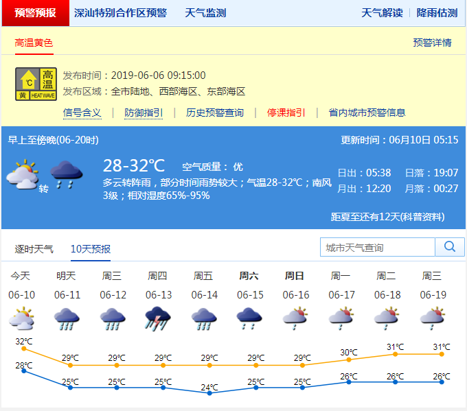 深圳新聞網(wǎng)2019年6月10日訊 在近幾日副熱帶高壓的影響下,深圳迎來了久違的“深圳藍”。不過,市民們在享受通透的藍天夏日的同時,也承受著不斷升溫的“燒烤模式”。2019年6月6日上午09時15分深圳市氣象臺發(fā)布了今年的首個高溫黃色預(yù)警信號,2019年6月9日羅湖區(qū)東門自動站記錄到36.2℃高溫。氣溫圖上一片橙色紅色,簡直成了一只“紅燒雞腿”。