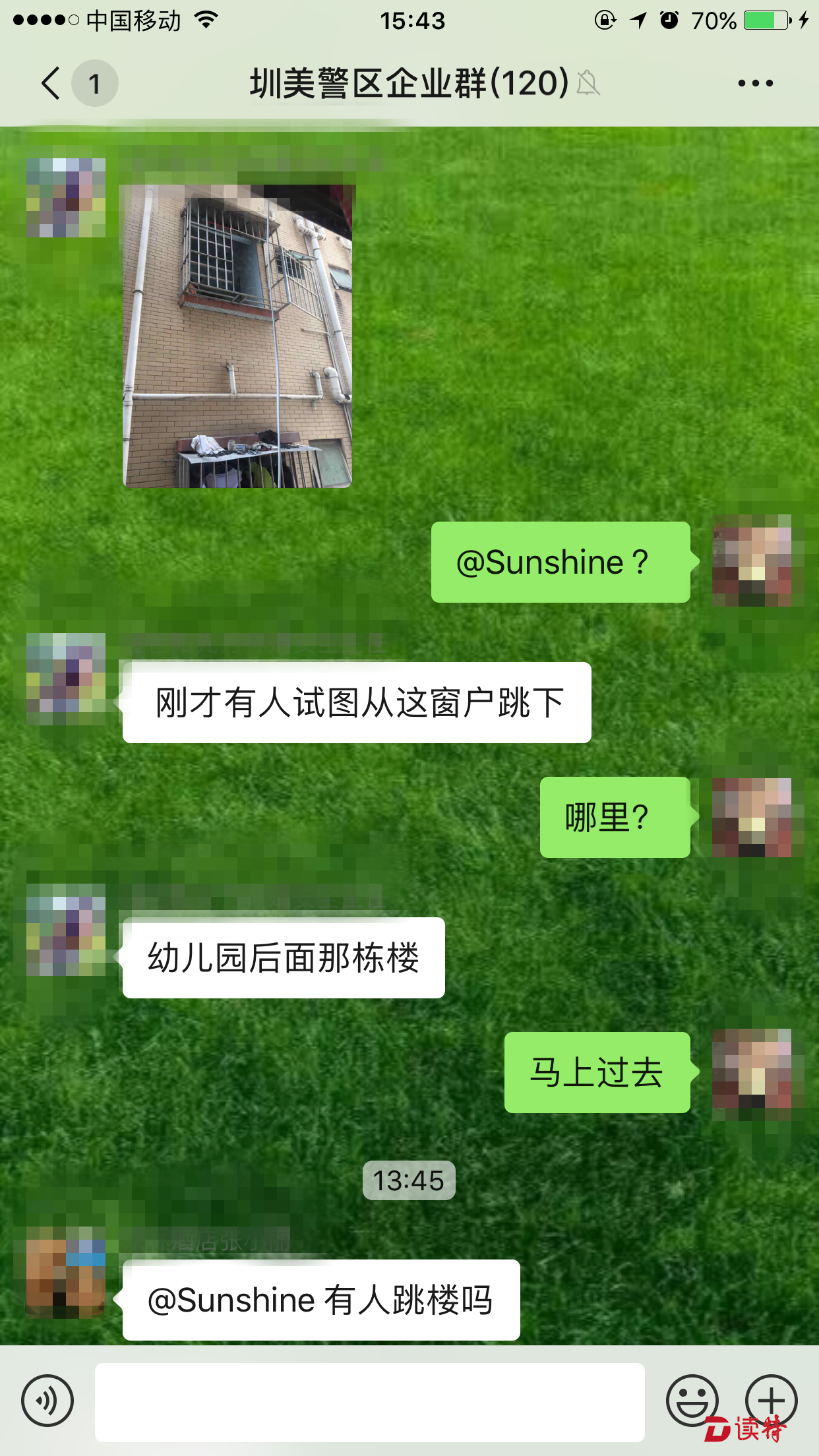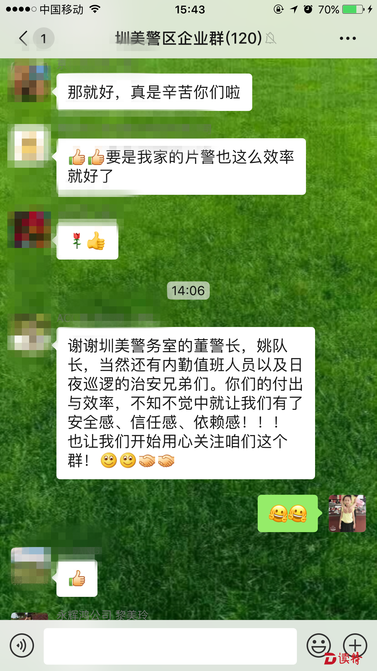 就在圳美警區(qū)隊員現(xiàn)場處置的過程中,微信群中的成員紛紛詢問事件情況。在了解到圳美警務(wù)室的隊員不到1分鐘就趕到現(xiàn)場后,大家對警區(qū)工作人員接連點(diǎn)贊。(讀特記者 王茂程 通訊員 胡澤瑜 溫小龍)
