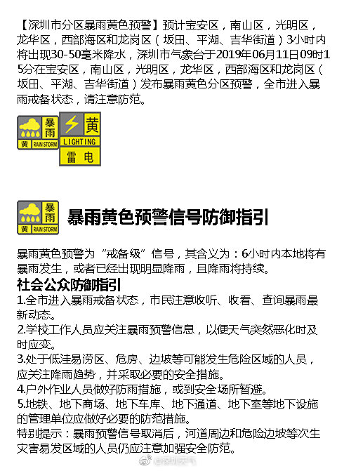 【深圳市分區(qū)暴雨黃色預(yù)警】預(yù)計(jì)寶安區(qū),南山區(qū),光明區(qū),龍華區(qū),西部海區(qū)和龍崗區(qū)(坂田、平湖、吉華街道)3小時(shí)內(nèi)將出現(xiàn)30-50毫米降水,深圳市氣象臺(tái)于2019年06月11日09時(shí)15分在寶安區(qū),南山區(qū),光明區(qū),龍華區(qū),西部海區(qū)和龍崗區(qū)(坂田、平湖、吉華街道)發(fā)布暴雨黃色分