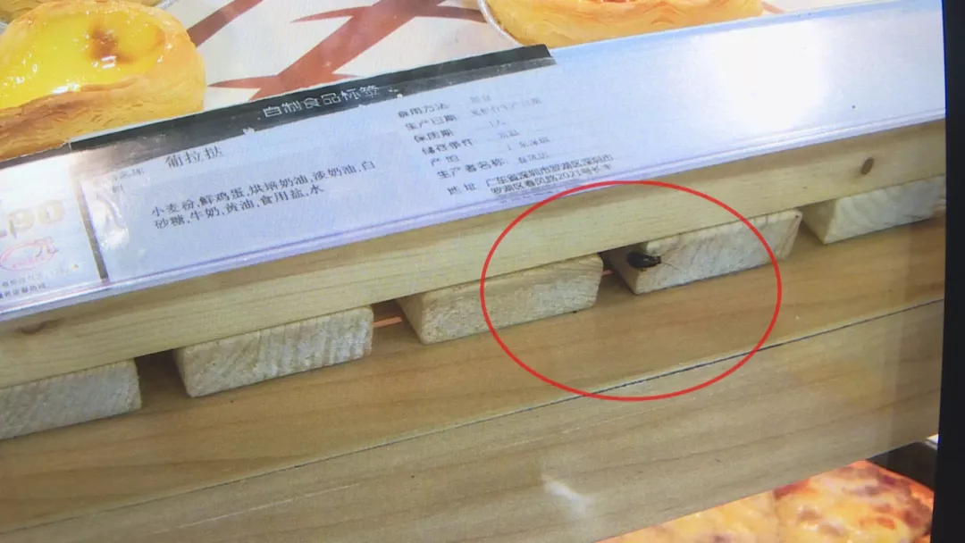 記者在柜前觀察了約10分鐘,發(fā)現(xiàn)一些小蟑螂已在柜里開起了派對,當(dāng)時僅鏡頭所能記錄下來的,就有4只!有些在柜子邊緣游走,有些則直接竄上貨架,和這些糕點親密接觸。