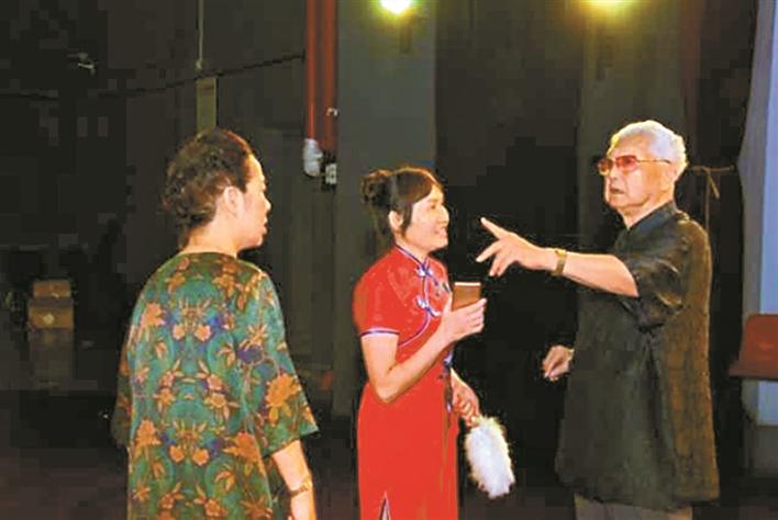 2019年4月,譚嗣英(右一)在2018~2019年深圳中老年藝術團隊年度優(yōu)秀節(jié)目展演《祖國頌》系列節(jié)目彩排時現(xiàn)場指導。