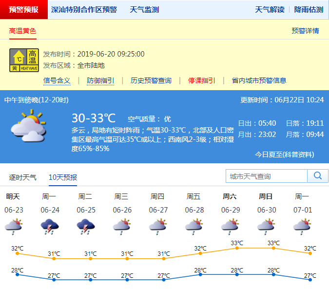 深圳新聞網2019年6月22日訊 受副熱帶高壓的影響,近幾日深圳氣溫持續(xù)上升,昨日(夏至)白天最高氣溫32℃~34℃,中北部及人口密集區(qū)最高氣溫達到35℃以上,全市高溫黃色預警生效中。周末恰逢中考到來(6月22日至24日),預計22日天氣炎熱到酷熱,中北部及人口密集區(qū)最高氣溫可達35℃或以上,提醒考生家長出門做好防暑降溫措施。