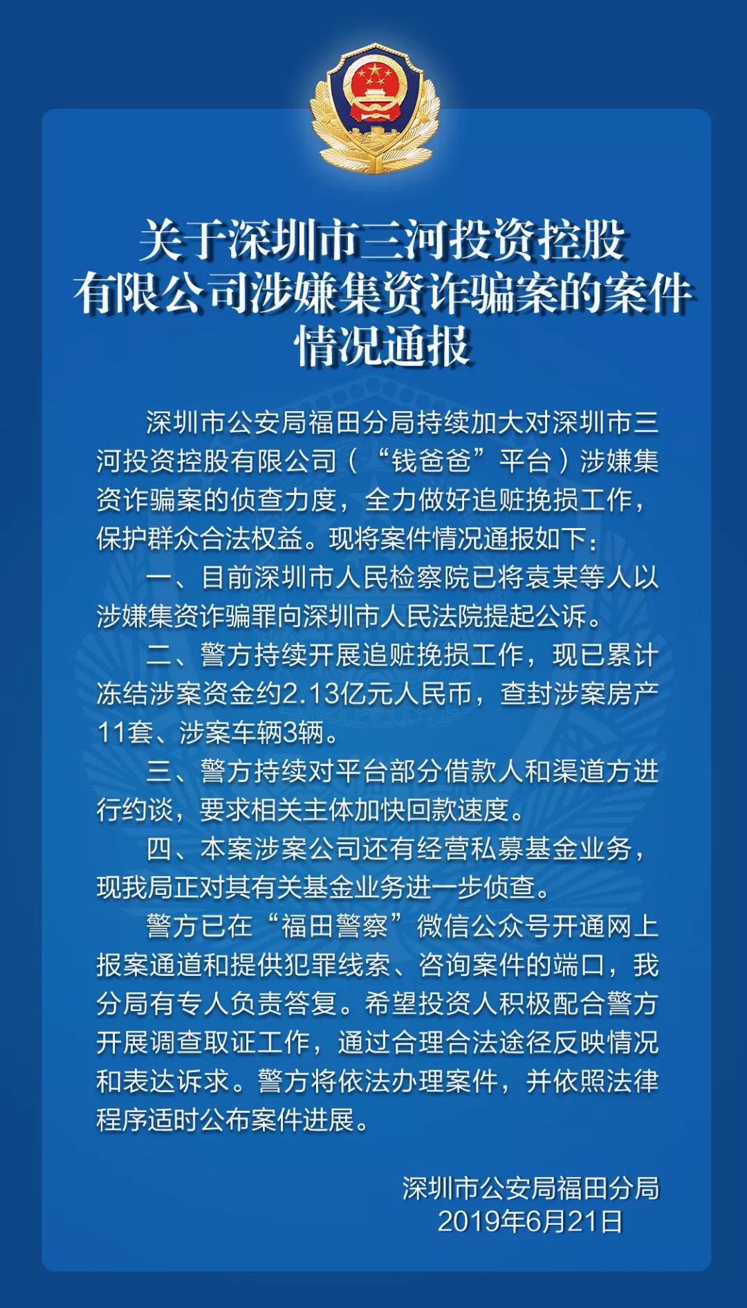關于深圳市三河投資控股有限公司涉嫌集資詐騙案的案件情況通報