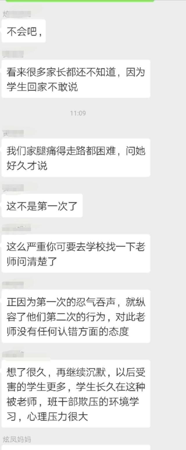 王先生把女兒的情況反映到家長群里,結(jié)果群里的家長紛紛表示,自己的孩子也反映當天遭遇到班長的毆打,有的孩子甚至“腿疼得難以走路”。