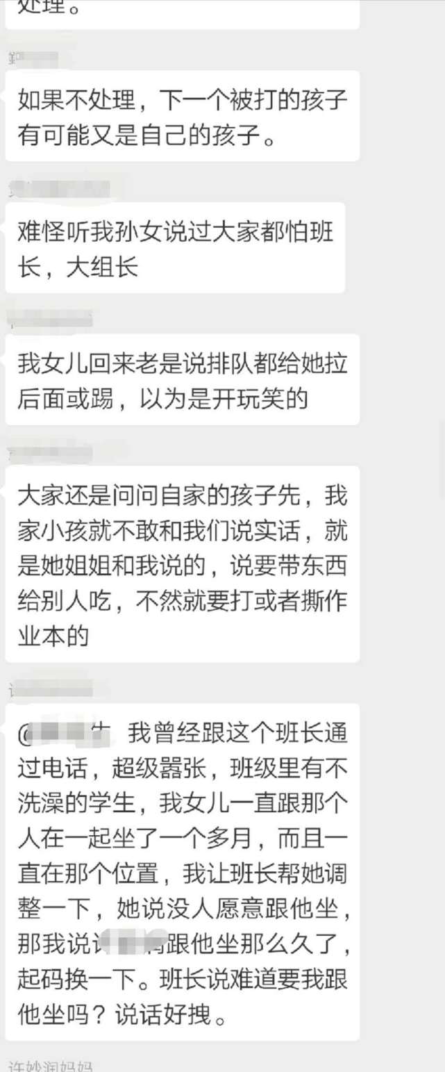 王先生把女兒的情況反映到家長群里,結(jié)果群里的家長紛紛表示,自己的孩子也反映當(dāng)天遭遇到班長的毆打,有的孩子甚至“腿疼得難以走路”。而據(jù)孩子反映,其實(shí)類似的毆打在班上已經(jīng)不止發(fā)生過一次。這名班長是女生,平時很受班主任的信任,經(jīng)常利用班干部的權(quán)力隨意懲罰學(xué)生。“她曾經(jīng)多次要求班上同學(xué)給自己帶零食吃,不然就會被撕作業(yè)和毆打,還威脅不準(zhǔn)告訴家長。”王先生稱,家長們已經(jīng)將情況反映給班主任,但是班主任的反應(yīng)“相當(dāng)冷淡”,只是說會了解一下情況。25日下午,記者電話聯(lián)系到了王先生女兒的班主任,他表示已經(jīng)就此事對班長進(jìn)行了批評教育,但對于班長此前多次毆打同學(xué)的行為他表示并不知情,“當(dāng)初讓這名同學(xué)做班長是因?yàn)樗煽兒?,而且守紀(jì)律。而且我覺得,孩子之間有些矛盾很正常?!卑嘀魅握f。(記者 李東明)