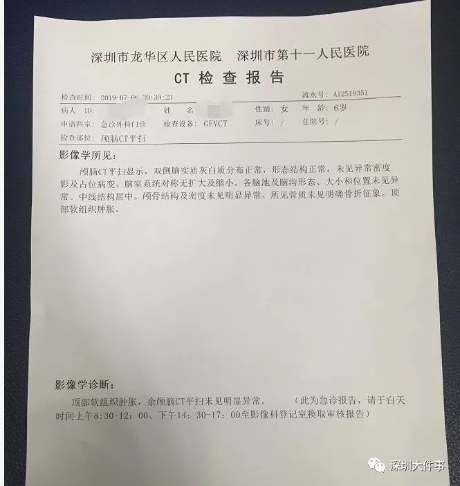據(jù)市民李女士報(bào)料稱,7月6日晚上8時(shí)許,在龍華區(qū)弓村一巷一位6歲女童被樓上掉下的瓶子砸中頭部,血流不止。隨后女童被父母送往附近社康醫(yī)治,但因傷口太深社康無法治療,遂被送往龍華人民醫(yī)院救治。